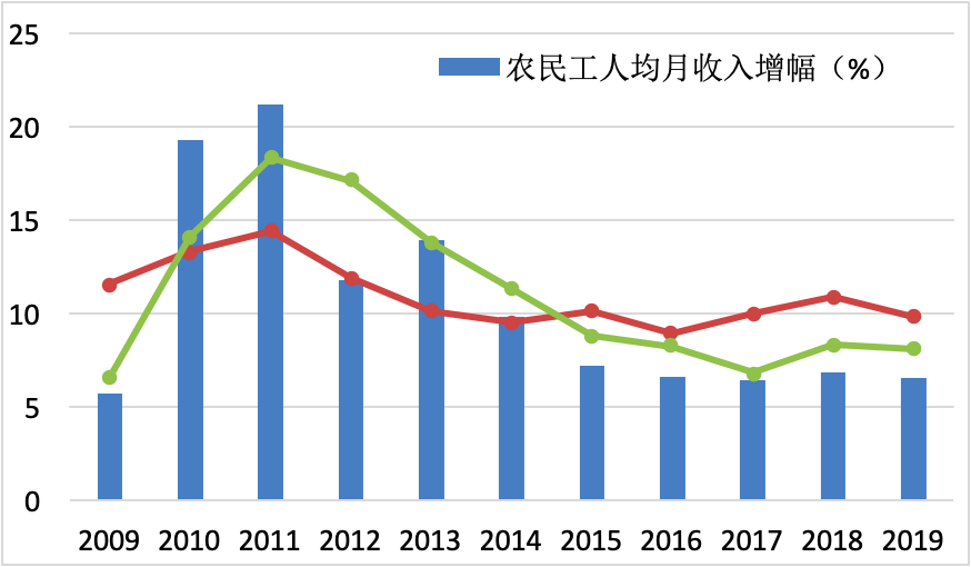 農(nóng)民工工資在2010年前后曾有過較快的提高,主要得益于各地最低工資的調(diào)整。值得注意的是,農(nóng)民工工資收入相對(duì)增速2015年后開始下降。農(nóng)民工年平均收入2017年是城鎮(zhèn)非私營單位職工平均收入的56%,2019年下降為52.5%。