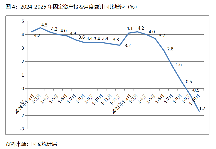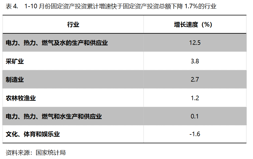 1-10月份,固定資產(chǎn)投資累計(jì)增速快于固定資產(chǎn)投資總額下降1.7%的行業(yè)共6個(gè),即電力、熱力、燃?xì)饧八纳a(chǎn)和供應(yīng)業(yè)增長(zhǎng)12.5%,采礦業(yè)增長(zhǎng)3.8%,制造業(yè)增長(zhǎng)2.7%。農(nóng)林牧漁業(yè)增長(zhǎng)1.2%,交通運(yùn)輸、倉儲(chǔ)和郵政業(yè)增長(zhǎng)0.1%,文化、體育和娛樂業(yè)下降1.6%。