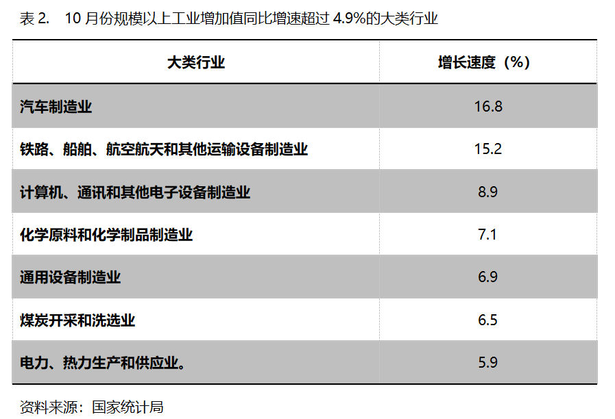 10月份,增長(zhǎng)速度超過規(guī)模以上工業(yè)增長(zhǎng)4.9%的主要大類行業(yè)共有7個(gè),即汽車制造業(yè)增長(zhǎng)16.8%,鐵路、船舶、航空航天和其他運(yùn)輸設(shè)備制造業(yè)同比增長(zhǎng)15.2%,計(jì)算機(jī)、通訊和其他電子設(shè)備制造業(yè)增長(zhǎng)8.9%,化學(xué)原料和化學(xué)制品制造業(yè)增長(zhǎng)7.1%,通用設(shè)備制造業(yè)增長(zhǎng)6.9%,煤炭開采和洗選業(yè)增長(zhǎng)6.5%,電力、熱力生產(chǎn)和供應(yīng)業(yè)增長(zhǎng)5.9%。