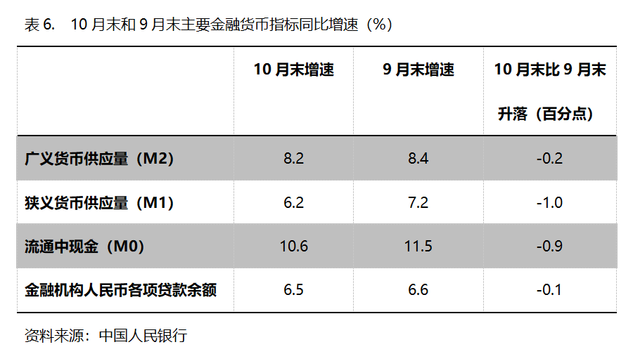 六、M2增速持續(xù)回落。10月末,廣義貨幣供應(yīng)量(M2)同比增長(zhǎng)8.2%,比9月末增長(zhǎng)8.4%回落0.2個(gè)百分點(diǎn),9月末比8月末增長(zhǎng)8.8%回落0.4個(gè)百分點(diǎn);狹義貨幣供應(yīng)量(M1)同比增長(zhǎng)6.2%,比9月末增長(zhǎng)7.2%回落1.0個(gè)百分點(diǎn),9月末增幅比8月末增長(zhǎng)6.0%回升1.2個(gè)百分點(diǎn);流通中貨幣(M0)同比增長(zhǎng)10.6%,比9月末增長(zhǎng)11.5%回落0.9個(gè)百分點(diǎn),9月末比8月末增長(zhǎng)11.7%回落0.2個(gè)百分點(diǎn)。10月份末,M2、M1和M0增速均出現(xiàn)了回落,需要關(guān)注其對(duì)經(jīng)濟(jì)運(yùn)行走勢(shì)的影響。